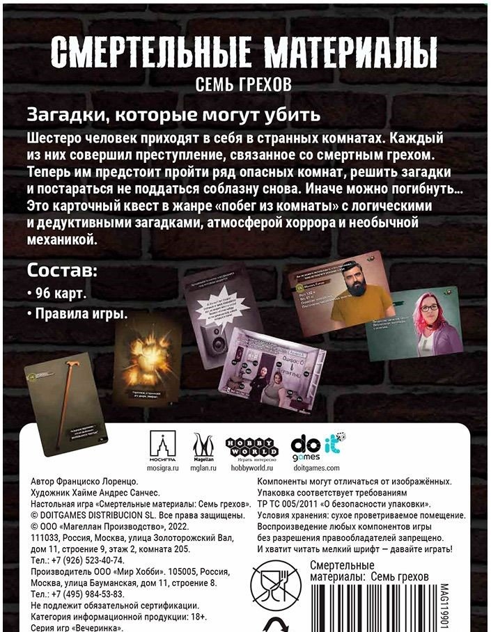 Настольная игра "Смертельные материалы: Семь грехов" – это карточный детективный квест в лучших традициях жанра Escape Room (побег из комнаты). В начале игры шестеро преступников, совершивших один из смертных грехов, оказываются запертыми в необычной комнате: на их шеях ошейники, бьющие током, а память стёрта – они не помнят ничего ни о себе, ни друг о друге. Проявите максимальную сосредоточенность и помогите героям заслужить жизнь, хоть и в неволе, но всё же. Если, конечно, справитесь с испытаниями. Или же если захотите. Никто не знает, какие подробности вскроются о каждом герое...