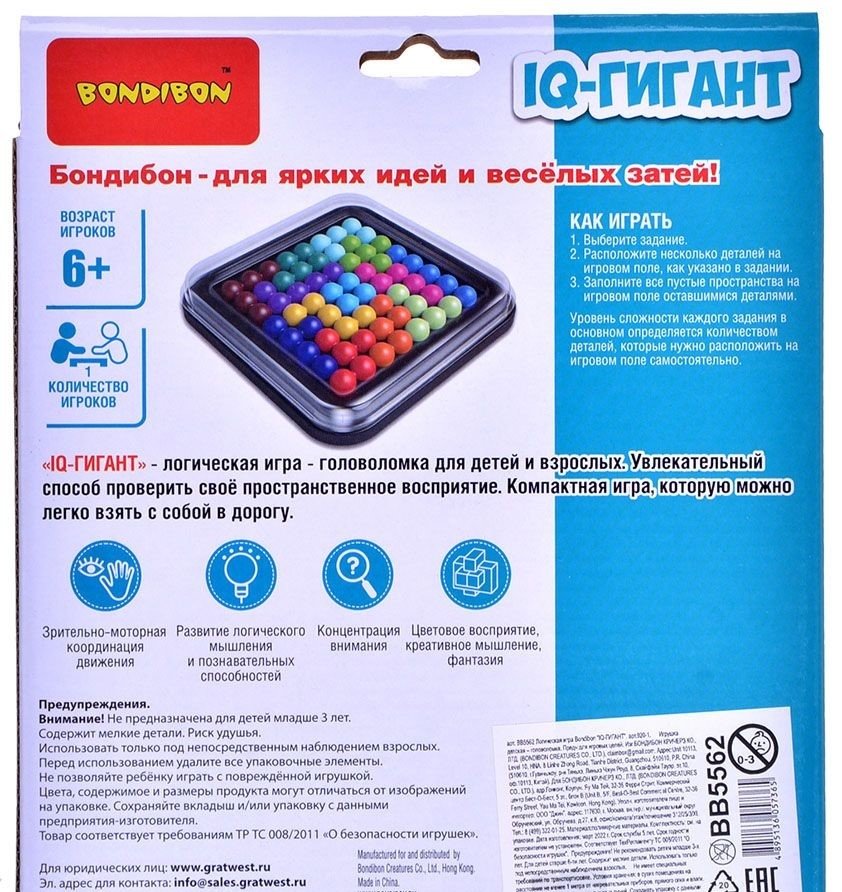 Головоломка "IQ-Гигант" представляет собой набор причудливых разноцветных фигур, собранных из множества шариков. Задача игрока – расположить фигуры на поле определённым образом согласно заданию. То есть, известен только конечный результат, к которому игрок должен прийти сам. Это увлекательная игра для детей, которая привлечёт внимание своей яркостью и необычными фигурами. Она отлично развивает пространственное мышление, концентрацию внимания и зрительное восприятие форм и объектов. 40 разнообразных заданий не дадут заскучать, а постоянно повышающаяся сложность задач натренирует полезные навыки ребёнка. Удобное поле с крышкой и компактный формат самой головоломки позволят легко взять её с собой в дорогу.