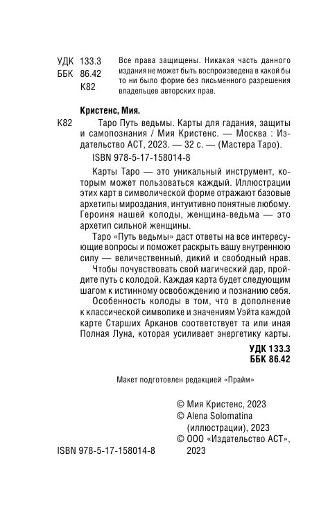 Перед вами колода-путешествие, а каждая карта в ней — подсказка и шаг вперед, которые приведут вас туда, где вам суждено находиться. В центре сюжета — юная ведьма, которая олицетворяет собой сильную, необузданную женскую энергию, живущую в каждой из нас. От самой первой карты до последней она познает себя, вступает в свои права и высвобождает внутреннюю силу.