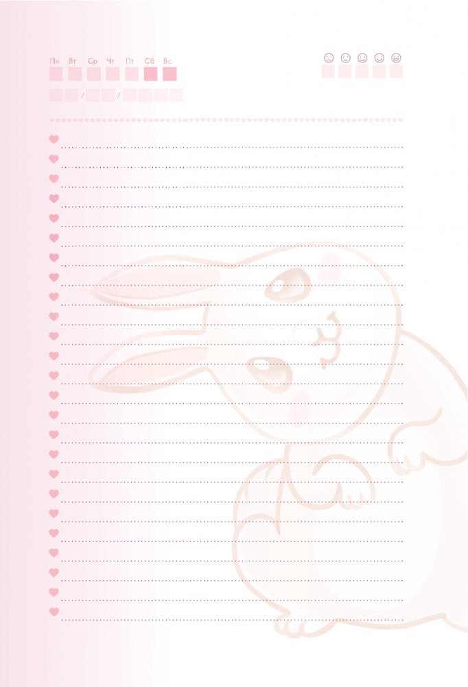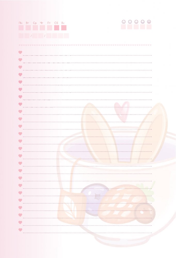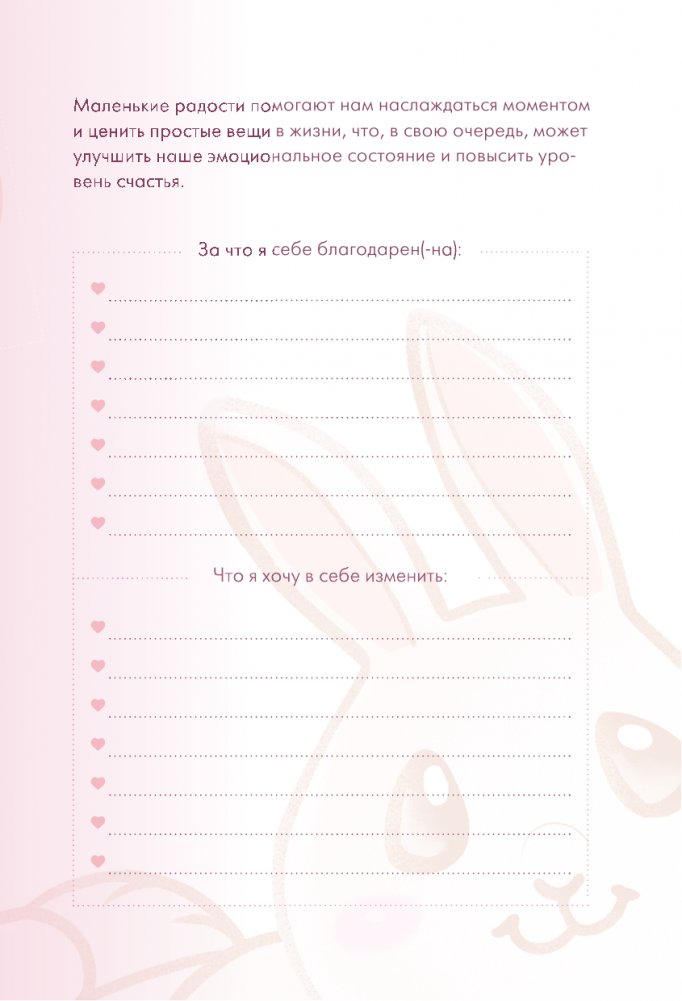 Sweet-ежедневник содержит чек-листы, трекеры настроения, а также листы для записей ваших мыслей и идей. Страницы с раскрасками помогут расслабиться и снять стресс, а милые зайчики поднимут настроение и создадут атмосферу уюта.