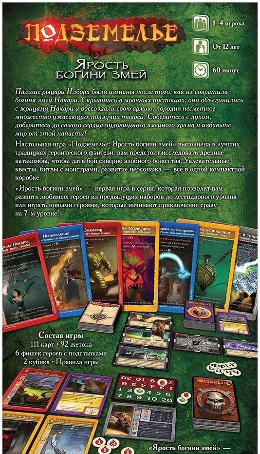"Подземелье: Ярость богини змей" – карточная фэнтези-игра, где вашим персонажам предстоит исследовать подземелье, которое вы будете строить с помощью карточек, сражаясь с монстрами, выполняя квесты и повышая по пути уровень героя. Как и другие версии настолок из серии "Подземелье", "Ярость богини змей" является самостоятельной игрой, которую можно с лёгкостью комбинировать с другими колодами, расширяя границы игры, что, несомненно, принесёт вам ещё больше удовольствия от исследования подземелий.