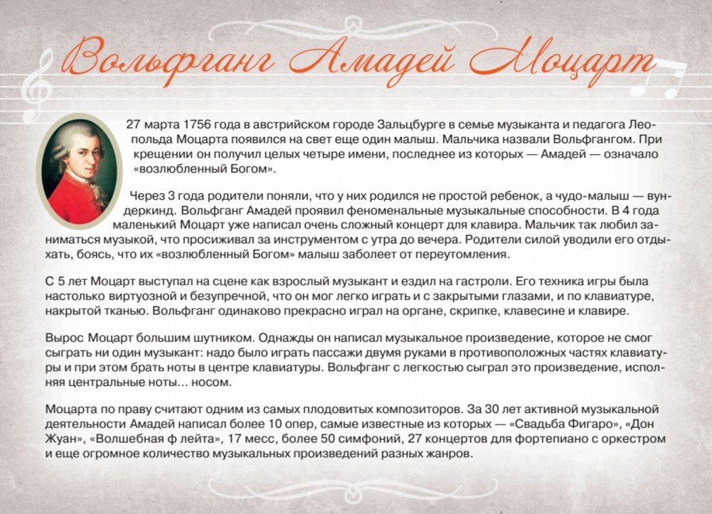 Нотная тетрадь удобного формата с необходимой справочной информацией. Краткая биография Вольфганга Амадея Моцарта вдохновит ребенка на музыкальные подвиги!