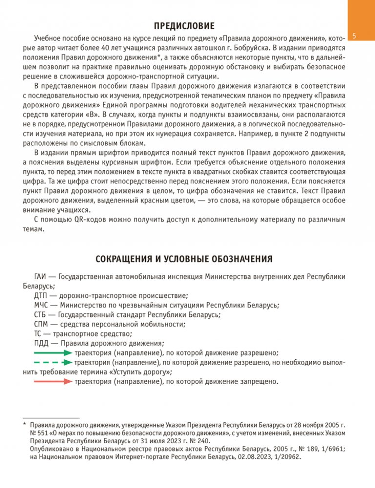 Учебное пособие разработано на основании Правил дорожного движения, утвержденных Указом Президента Республики Беларусь от 28 ноября 2005 г. № 551 «О мерах по повышению безопасности дорожного движения», с изменениями, внесенными Указом Президента Республики Беларусь от 4 августа 2025 г. № 295 «Об изменении Указа Президента Республики Беларусь», и в соответствии с Единой программой подготовки водителей механических транспортных средств категории «В», утвержденной постановлением Министерства транспорта и коммуникаций Республики Беларусь от 23 октября 2012 г. № 47 (с изменениями, внесенными постановлением Министерства транспорта и коммуникаций Республики Беларусь от 17 сентября 2024 г. № 83).