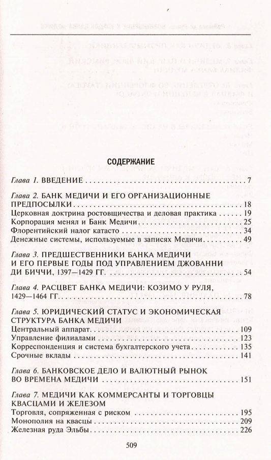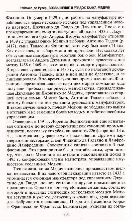 Представители семейства Медичи широко известны благодаря своей выдающейся роли в итальянском Возрождении. Однако их деятельность в качестве банкиров и торговцев мало изучена. Хотя именно экономическая власть позволила им захватить власть политическую и монопольно вести дела в Европе западнее Рейна. Обширный труд Раймонда де Рувера создан на основе редчайших архивных документов. Он посвящен Банку Медичи — самому влиятельному в Европе XV века — и чрезвычайно важен для понимания экономики, политики и общественной жизни того времени. Любопытно и то, что история Банка Медичи перекликается с сегодняшним днем и обогащает наши познания об истоках современного бизнеса.