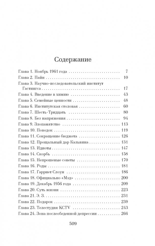 Все боятся Элизабет Зотт. Кто-то — ее ума, кто-то — остро заточенного карандаша, который она носит в прическе, а кто-то — четырнадцатидюймового ножа из ее сумочки (ведь каждый уважающий себя кулинар пользуется только своими собственными ножами). Причудливый зигзаг судьбы привел ее из Научно-исследовательского института Гастингса, где она мечтала заниматься абиогенезом (теорией возникновения жизни из неорганических веществ), на телевидение, где она ведет самую популярную в стране кулинарную передачу «Ужин в шесть». «Кулинария — это химия, — говорит она. — А химия — это жизнь. Она дает нам возможность изменить все, включая себя». Тем временем ее пятилетняя дочь Мадлен, растущая под присмотром минно-разыскного пса по кличке Шесть-Тридцать, пытается найти в школьной библиотеке Набокова и Нормана Мейлера, а также выстроить родословное древо, на котором должно найтись место и без пяти минут нобелевскому лауреату по химии Кальвину Эвансу, и фее-крестной, и деду в полосатой тюремной робе, и бабке, укрывшейся от налоговой полиции в Бразилии...