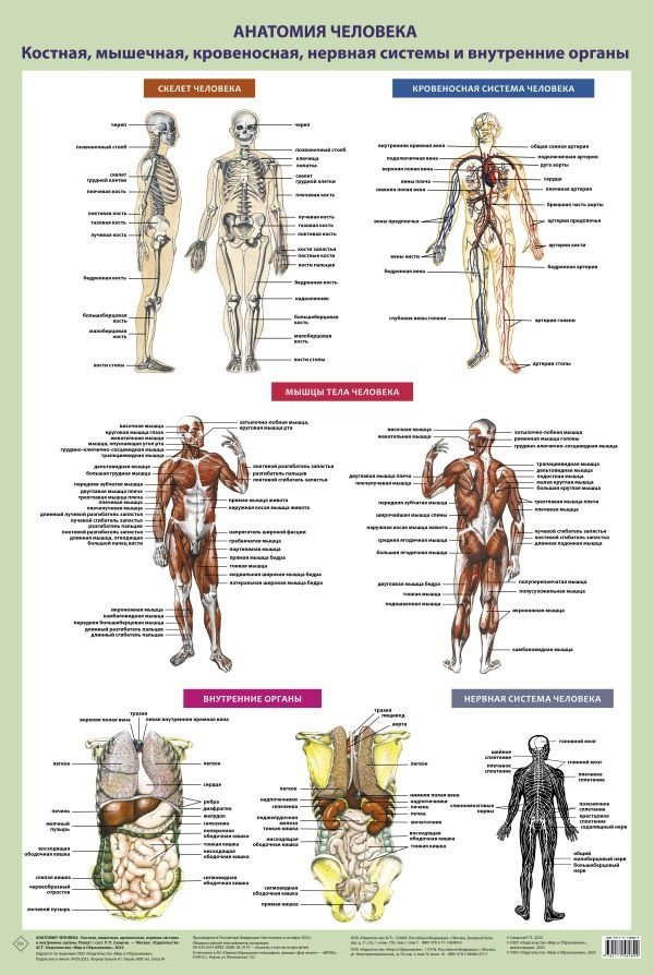 На плакате представлена полная анатомия человека: костная, мышечная, кровеносная, нервная системы и внутренние органы. Подойдёт для широкого круга читателей: школьников, студентов высших учебных заведений, художников и т.д. Простая терминология, понятные обозначения. От автора известных учебных пособий и атласов анатомии Р.П. Самусева.