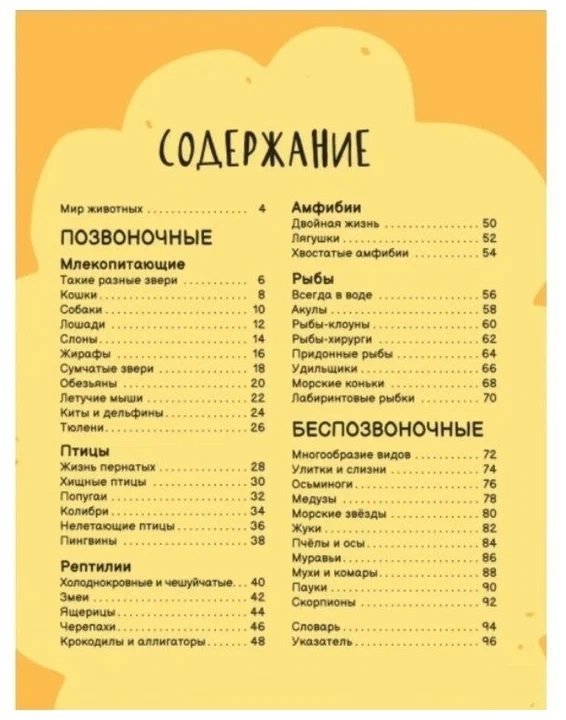 В книге собраны сведения о млекопитающих, птицах, рептилиях, рыбах, моллюсках, насекомых, пауках. Маленький читатель получит информацию о сходстве и различии разных видов животных, узнает, где они обитают, что едят, как охотятся и защищаются от врагов, ищут укрытия и выводят потомство. Интересные факты раскроют секреты сахарного поссума, коалы, кенгуру, рыбы-ежа, китовой акулы и сотен других удивительных животных. Яркие фотографии сделают знакомство с миром животных наглядным и увлекательным.