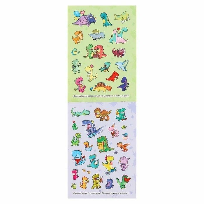 А что, если бы динозавры жили обычной жизнью: ходили в школу, катались на скейте, отдыхали в шезлонге?! Современные, яркие, смешные образы динозавриков поднимут настроение! Наклейками можно украсить ежедневник, тетради, скетчбук, телефон и многое другое!