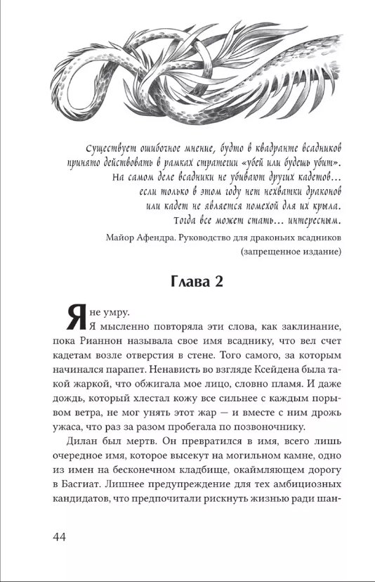 Двадцатилетняя Вайолет Сорренгейл готовилась стать писцом и спокойно жить среди книг и пыльных документов. Но ее мать – прославленный генерал, и она не потерпит слабости ни в каком виде. Поэтому Вайолет вынуждена присоединиться к сотням молодых людей, стремящихся стать элитой Наварры – всадниками на драконах.Однако из военной академии Басгиат есть только два выхода: окончить ее или умереть.Смерть ходит по пятам за каждым кадетом, потому что драконы не выбирают слабаков. Они их сжигают. Сами кадеты тоже будут убивать, чтобы повысить свои шансы на успех. Некоторые готовы прикончить Вайолет только за то, что она дочь своей матери. Например, Ксейден Риорсон — сильный и безжалостный командир крыла в квадранте всадников.Тем временем война, которую ведет Наварра, становится все более тяжелой, и совсем скоро Вайолет придется вступить в бой.
