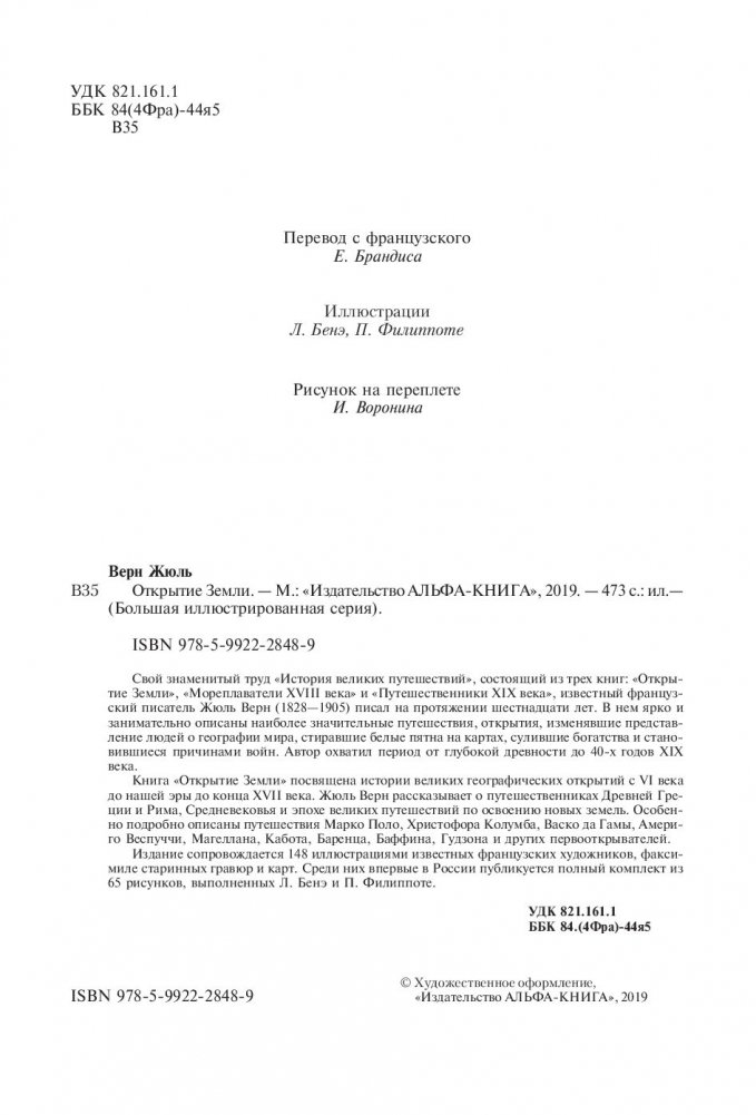 Свой знаменитый труд "История великих путешествий", состоящий из трех книг: "Открытие Земли", "Мореплаватели XVIII века" и "Путешественники XIX века", известный французский писатель Жюль Верн (1828-1905) писал на протяжении шестнадцати лет. В нем ярко и занимательно описаны наиболее значительные путешествия, открытия, изменявшие представление людей о географии мира, стиравшие белые пятна на картах, сулившие богатства и становившиеся причинами войн. Автор охватил период от глубокой древности до 40-х годов XIX века.Книга "Открытие Земли" посвящена истории великих географических открытий с VI века до нашей эры до конца XVII века. Жюль Верн рассказывает о путешественниках Древней Греции и Рима, Средневековья и эпохе великих путешествий по освоению новых земель. Особенно подробно описаны путешествия Марко Поло, Христофора Колумба, Васко да Гамы, Америго Веспуччи, Магеллана, Кабота, Баренца, Баффина, Гудзона и других первооткрывателей.