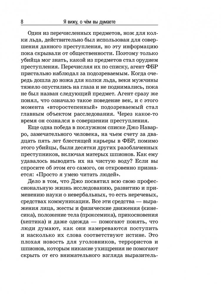 Джо Наварро, бывший агент контрразведки ФБР, которого коллеги называют живым детектором лжи, научит вас моментально «сканировать» собеседника, расшифровывать едва заметные сигналы в его поведении, распознавать завуалированные эмоции и сразу же подмечать малейшие подвохи и признаки лжи. Вы узнаете, как язык вашего тела может повлиять на мнение о вас шефа, коллег по работе, родных, друзей и просто посторонних людей, и получите в свое распоряжение эффективный способ управления реальностью.