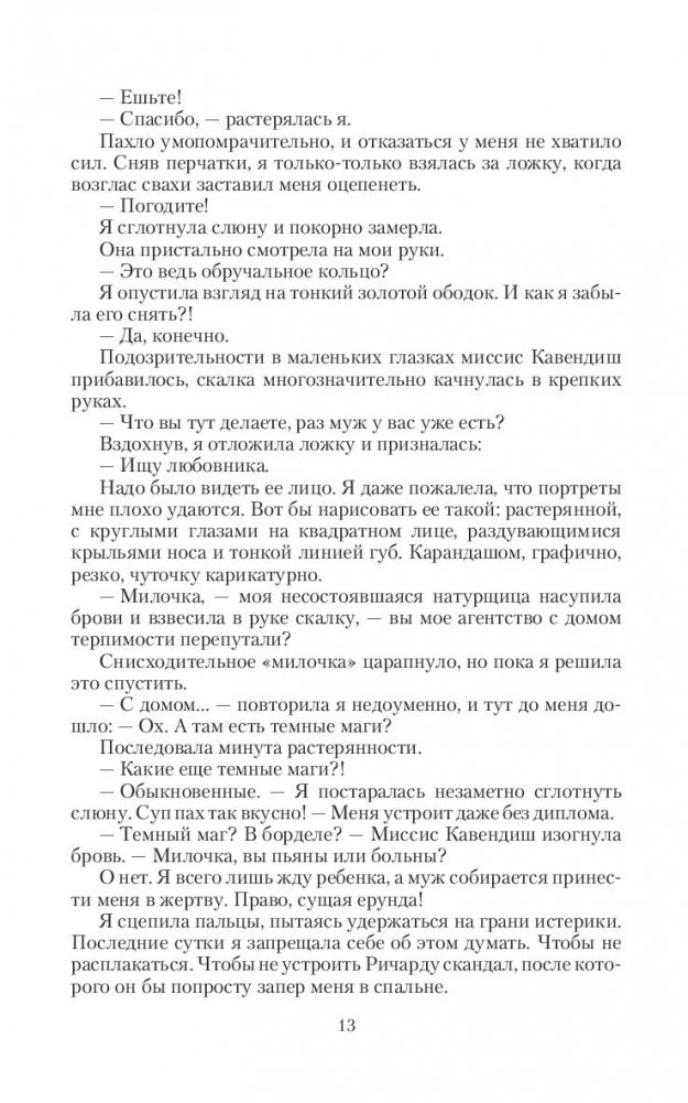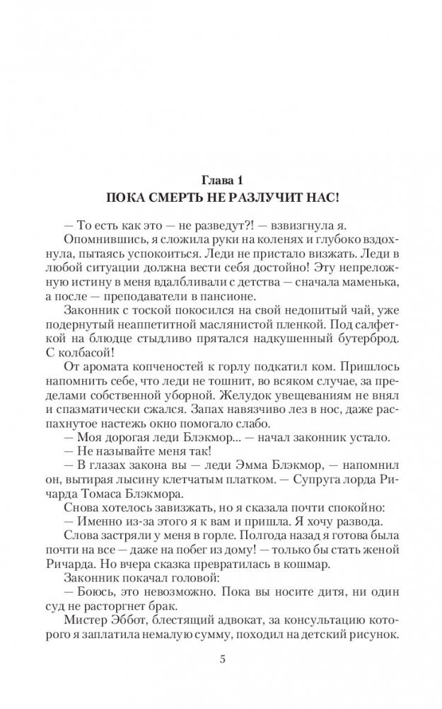 Выходите замуж за темного мага? Внимательно читайте брачный контракт, включая самый мелкий шрифт! Иначе в один прекрасный день можете оказаться на алтаре, а тот, кто заносит над вами ритуальный нож, будет не кто иной, как любимый муж…Леди Эмма Блэкмор клялась супругу в верности и послушании, покуда смерть не разлучит их. Однако если лорд Блэкмор полагал, что молодая жена покорно ляжет на алтарь, то просчитался.Когда на кону собственная жизнь и жизнь будущего ребенка, Эмма должна забыть о воспитании, манерах и - о ужас! - репутации. Ночевать на скамейке в парке, устроиться на работу, водить дружбу с призраками, расследовать убийства, учиться магии, даже найти фиктивного любовника - что угодно, лишь бы не возвращаться к предателю-мужу.Но что, если она все поняла не так?