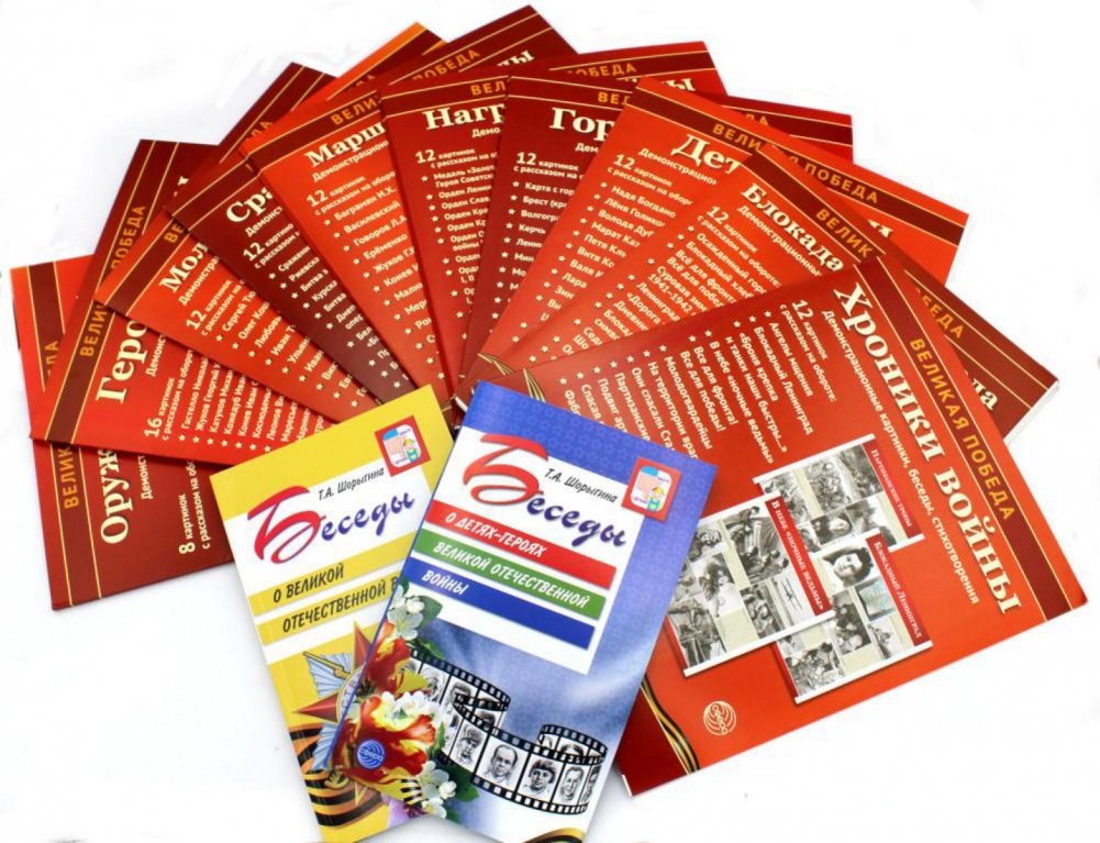 Комплект «Расскажем детям о Великой Отечественной войне» состоит из двух книг («Беседы о Великой Отечественной войне» и «Беседы о детях-героях Великой Отечественной войны») и 12 комплектов наглядных пособий с демонстрационными каринками, беседами и стихами.
