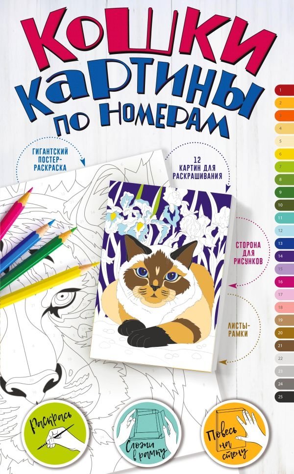 Гигантский постер-раскраска. Раскрась по номерам! 12 картин для раскрашивания посвященных нашим любимым и таким разным кошкам - милым и грозным, смешным и загадочным.