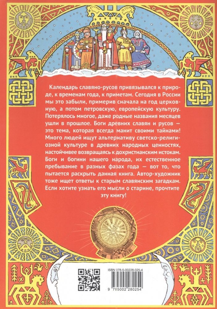 Книга писателя и художника Андрея Гусельникова посвящена народному календарю и славянским богам. Боги славян — это наследие всех индоевропейцев. Солнечные образы древних славян, мифы времён года, волшебство стихий воды, воздуха, огня и земли — всё это найдёт читатель в новой книге! Такие имена, как Велес, Перун, Лада, Макошь, Ярило, Даждьбог пронзают слух современных любителей древнеславянского наследия. При произношении имён родных богов сразу же срабатывает генетическая память. Люди хотят той романтики, с которой жили их пращуры в природе… В книге дано авторское видение богов. Автор показывает скрытый смысл в народных узорах, дошедших до наших дней, изучает тему архаичной старины, прорабатывая её в иллюстративных образах. В книге приводятся не только чёрно-белые иллюстрации, но и цветные — с графическими изображениями Велеса и Перуна, а также мифологического мирового древа. Есть в настоящем издании и новинка — календарь с приметами, а также с названиями фаз года.