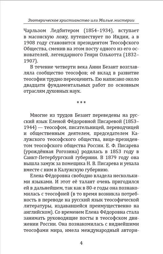 «Эзотерическое христианство» — известная работа Анни Безант (1847–1933) — талантливой писательницы, президента Теософского Общества, ученицы и последовательницы Е. П. Блаватской. В этой книге основные положения христианской религии и жизнь Иисуса Христа рассматриваются с позиций мистической философии и теософии. Автор раскрывает перед читателем глубинный смысл искупления и отпущения грехов, святых таинств, молитв и вознесения.