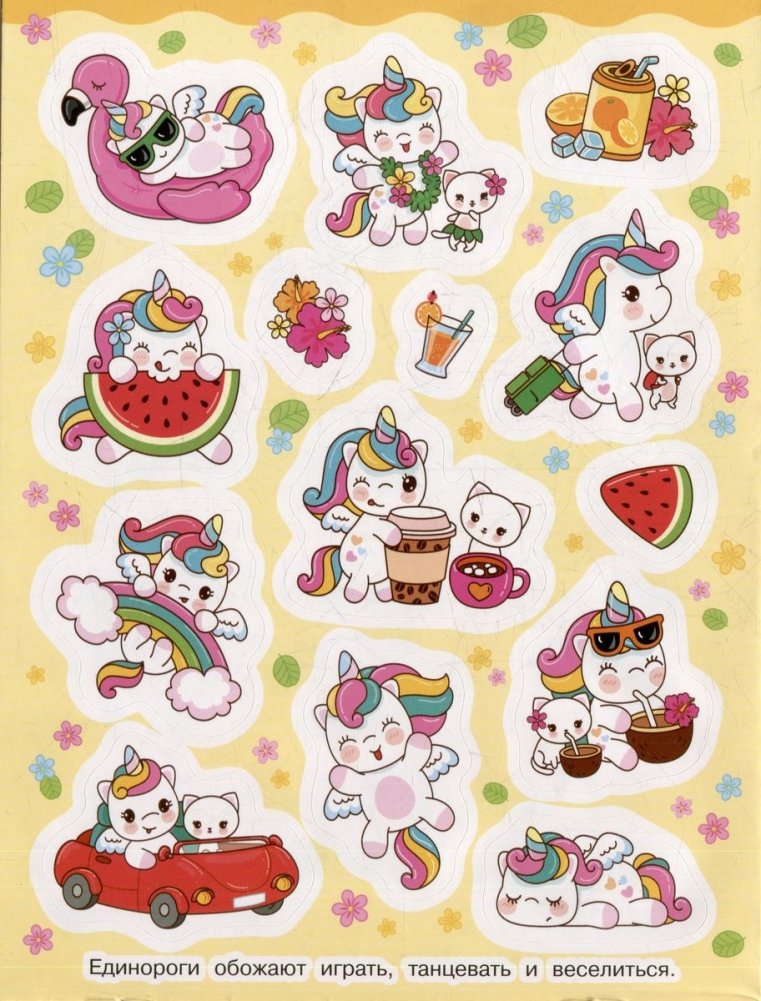 Коничива! (Добрый день!) Кавайные единорожки не дадут вам скучать! Играть, танцевать, путешествовать – каждый день можно делать что-то интересное. Уникальные яркие иллюстрации поднимут настроение даже в самый хмурый день. Наклейками можно украсить ежедневник, тетради, скетчбук, телефон и многое другое!