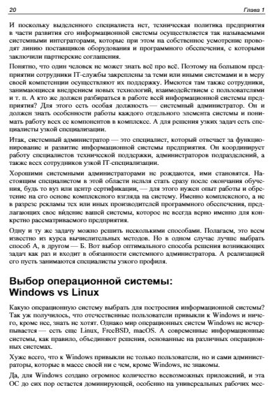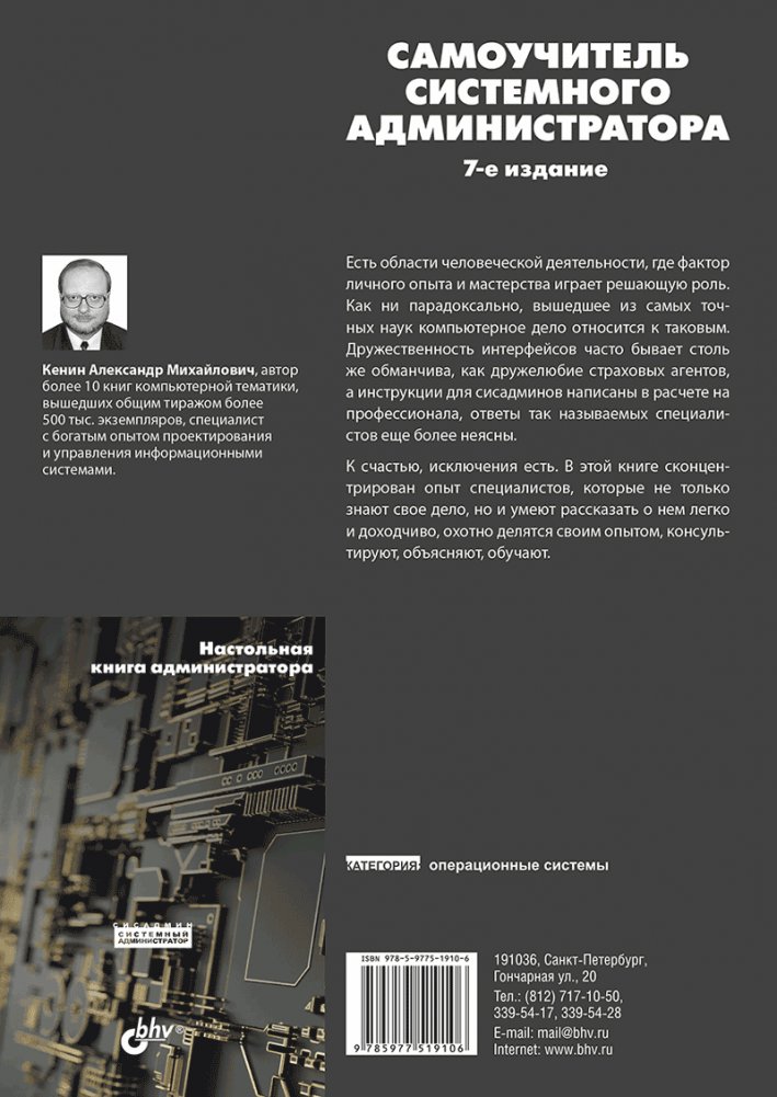 Изложены основные задачи системного администрирования, описаны базовые протоколы, даны рекомендации по выбору оборудования и проведению ежедневных рутинных операций. Подробно раскрыты технологии, используемые при построении информационных систем, описаны средства мониторинга и обслуживания как малых, так и распределённых сетей. Рассмотрены методы централизованного управления, основы создания безопасной среды. Даны рекомендации по поиску неисправностей, обеспечению защиты данных. Параллельно рассмотрены решения на основе операционных систем Windows и Linux с использованием как проприетарных, так и открытых технологий. Книга написана на основе многолетнего опыта разработки и практического администрирования информационных систем.