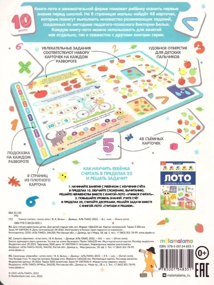 Книга-лото "Учимся считать"- это развивающее пособие для детей, которое разработано по методике Виктории Белых - педагога-психолога с 25-летним стажем работы с детьми. Занятия по этому пособию гарантируют максимальный прогресс в развитии вашего малыша.В книге 8 страниц с увлекательными заданиями и 48 плотных съёмных карточек с удобным отверстием для детских пальчиков.Под каждой карточкой спрятана картинка, которая играет ключевую роль в выполнении заданий. С помощью книги "Учимся считать" ребёнок познакомится с цифрами и освоит навыки счёта.Страницы толщиной в 2 мм выполнены из многослойного ламинированного картона, что позволит детально изучать и повторять материал огромное количество раз без ущерба для качества книги.Совет родителям: перед первым использованием достаньте все карточки и удалите защитные клапаны.