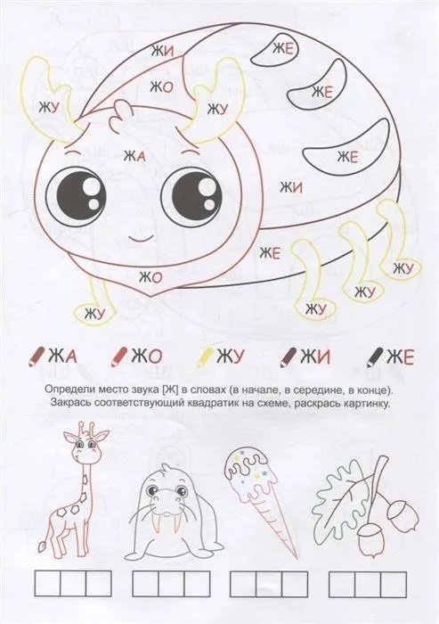 Ребенку предлагается произносить определенные слоги, одновременно раскрашивать детали рисунка, подбирать соответствующий цвет по образцу.