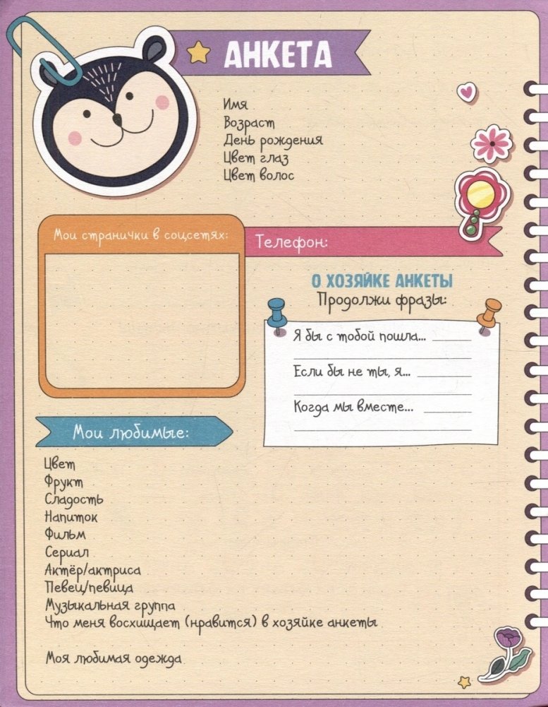 Анкета для девочек - это отличный подарок! Самые актуальные вопросы для подруг, интересные рубрики, тематические развороты и классные наклейки помогут весело провести время. А как интересно будет читать анкеты хозяйке после заполнения! Легкий способ узнать лучше своих подруг, подметить мелочи, которые раньше не замечал, или обнаружить общий интерес там, где и не думал его найти!