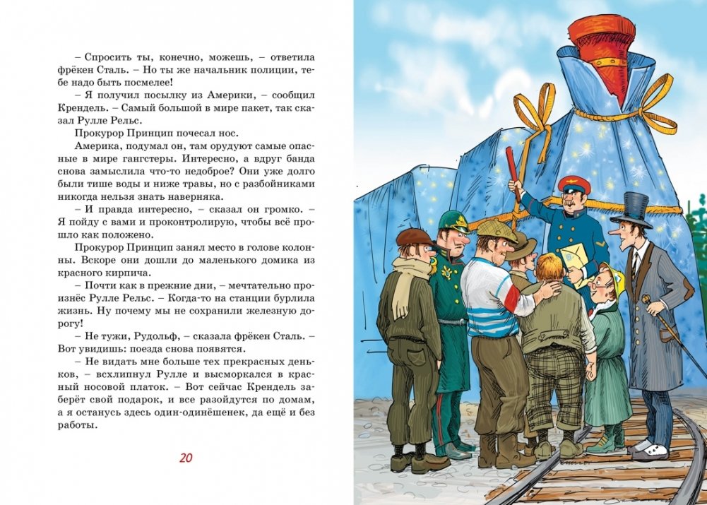 У Кренделя Петерсона, разбойника из провинциального шведского городка Гдеугодно, день рождения. И как вы думаете, что он получил в подарок? Паровоз с двумя вагонами! Да не игрушечными, а самыми настоящими. Жители городка в недоумении: как быть с таким подарком?.. И тут на помощь всем пришла фрёкен Сталь, которая любит весёлые приключения и озорные затеи. Она предложила устроить соревнование между паровозом и… автобусом.