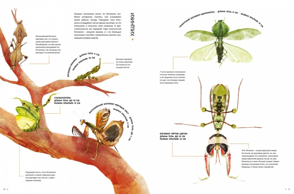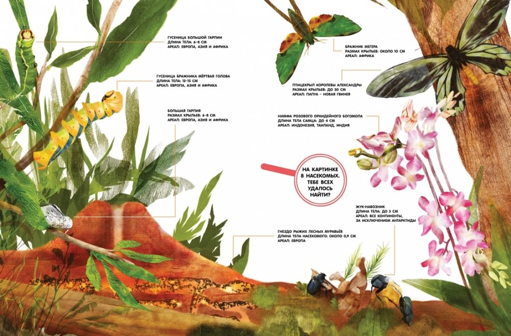 Кто крупнее – жук-геркулес или рогач-жираф? Почему богомола так назвали? Где живёт большая гарпия? На страницах этой книги ты можешь увидеть удивительных насекомых нашей планеты – мадагаскарскую комету, королевскую ореховую моль, жука-голиафа, белостому, рассмотреть жало бумажной осы, заднее крыло перуанского кузнечика, пчелиные соты. Большинство рисунков выполнено в натуральную величину! Книга содержит много интересной информации об ареале обитания насекомых, их размерах, особенностях, а также о способах маскировки от хищников. Рассмотри насекомых поближе и прочти факты о них: тебе откроется много секретов природного мира!