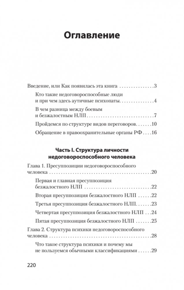 Вы узнаете, что такое безжалостное НЛП, как оно возникло и чем отличается от фундаментального боевого НЛП. Авторы описывают контексты применения безжалостного НЛП, его эффективность и примеры воздействия на окружающих. Также вы научитесь моделированию недоговороспособных переговорщиков и успешному использованию их принципов. В книге представлен психологический профиль шизоидов и агрессивных аутистов, дано объяснение, почему они успешны в своем безумстве и чем нам это грозит. Проведен анализ известных личностей: Чикатило, Гарольд Шипман, Рон Хаббард, Родион Раскольников, школьные стрелки, – что у них общего?