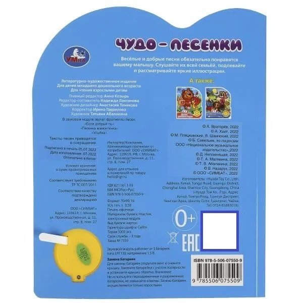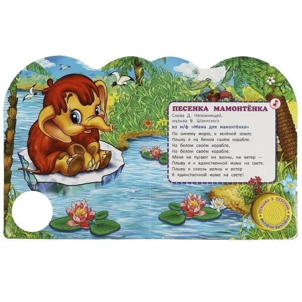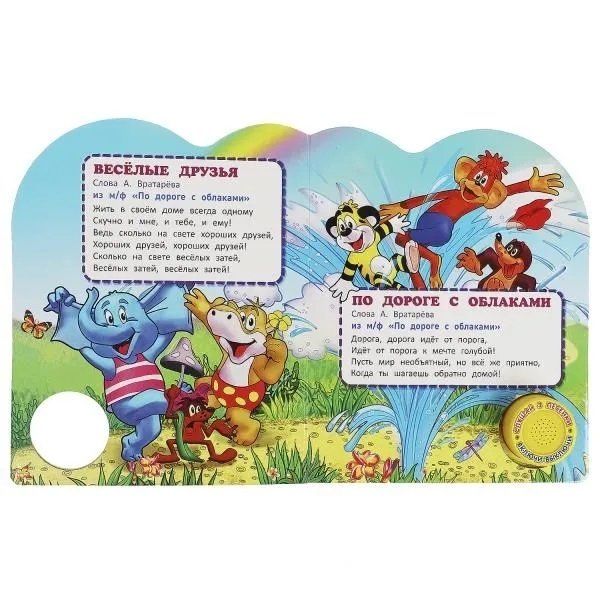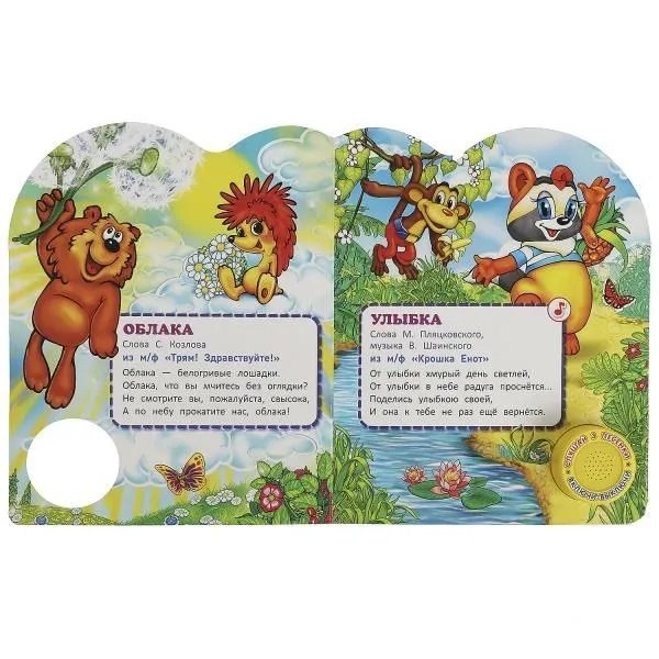 Ребёнок с удовольствием будет листать плотные страницы, рассматривать красочные картинки с изображением героев любимых мультфильмов и, конечно, нажимать на кнопку и слушать весёлые песенки. Малыш легко освоит включение звука: по нажатию на кнопку песенка включится, при втором нажатии выключится, при третьем - заиграет следующая композиция. Благодаря компактному размеру книгу удобно взять с собой в дорогу.