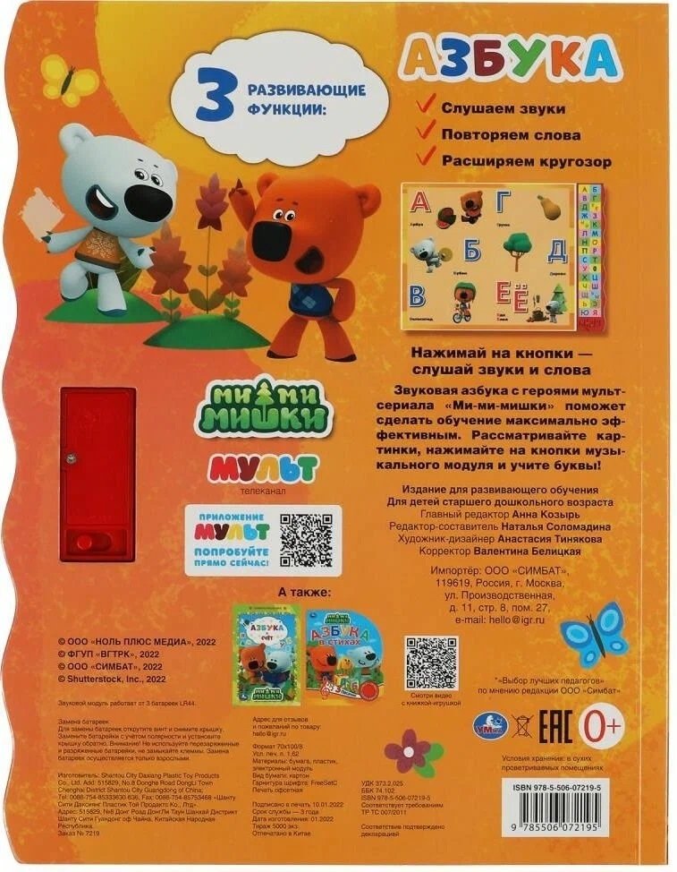 Озвученная книга Мимимишки Азбука – магнит, притягивающий внимание ребенка и увлекающий в свой мир. Это не просто музыкальная игрушка, а учебник на 10 страницах. Сокровище для малышей, стремящихся весело освоить звуки языка.