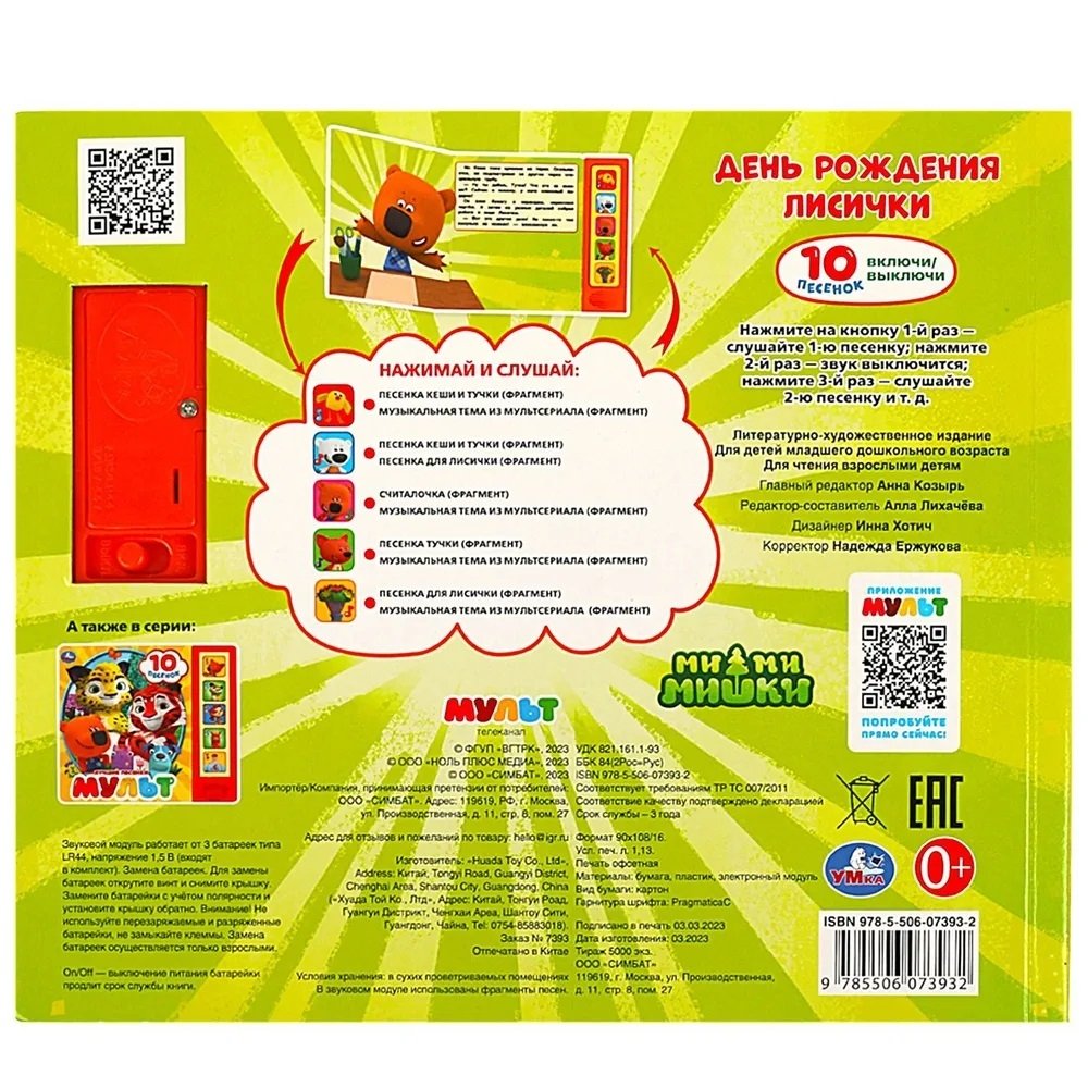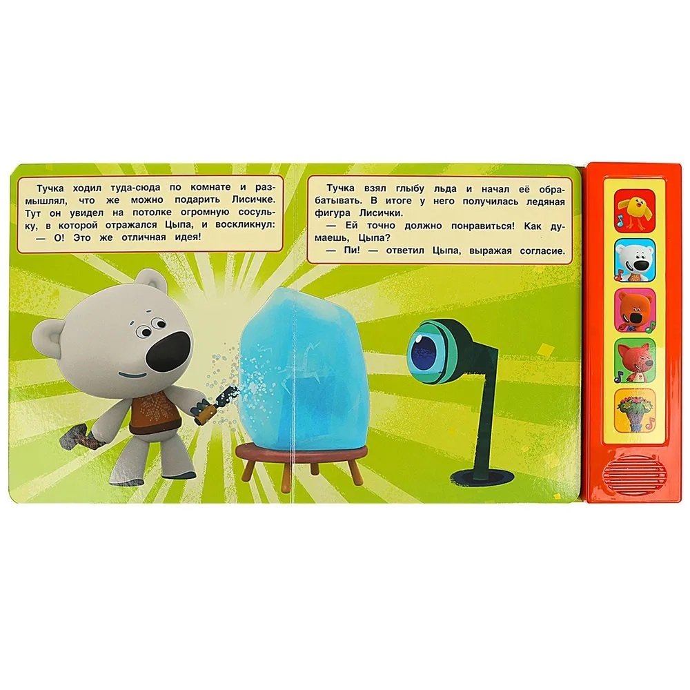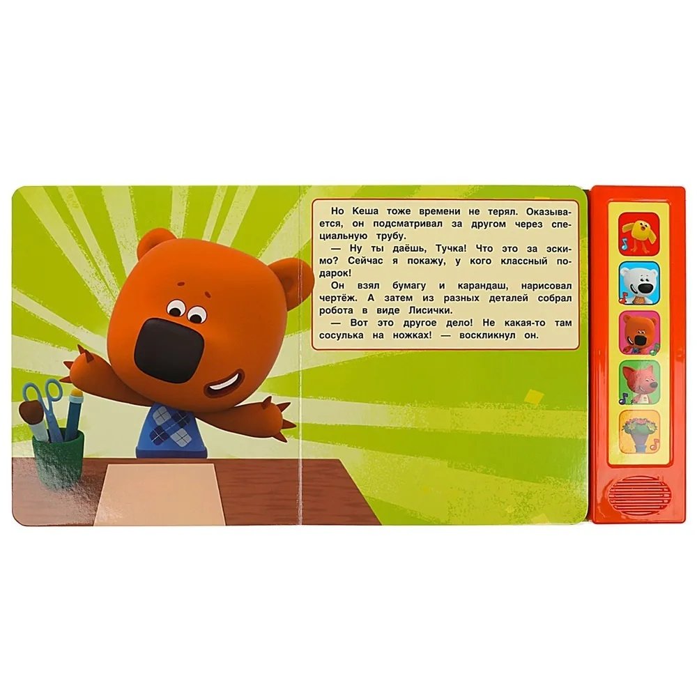 Внутри развивающей книжки-игрушки ребёнок найдёт всё для яркого и увлекательного приключения: 5 звуковых кнопок и 10 песенок из мультфильмов, среди которых , например, Ми-ми-мишки, Считалочка, Песенка для Лисички и другие.