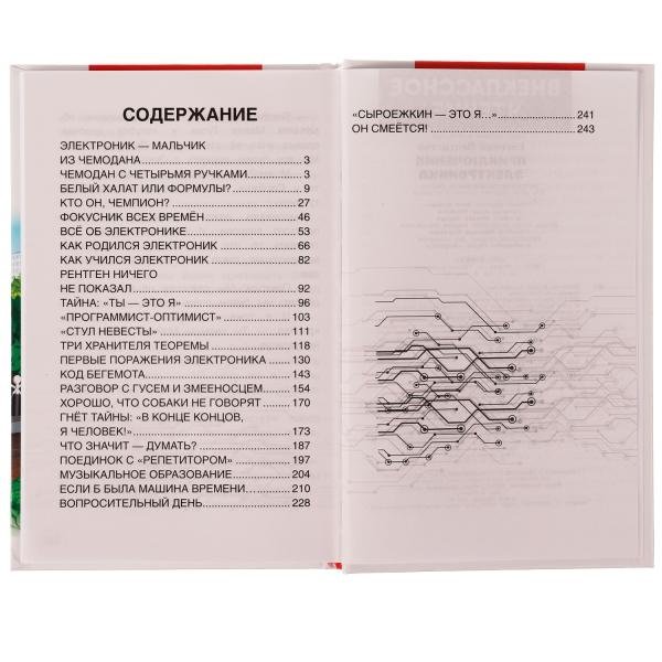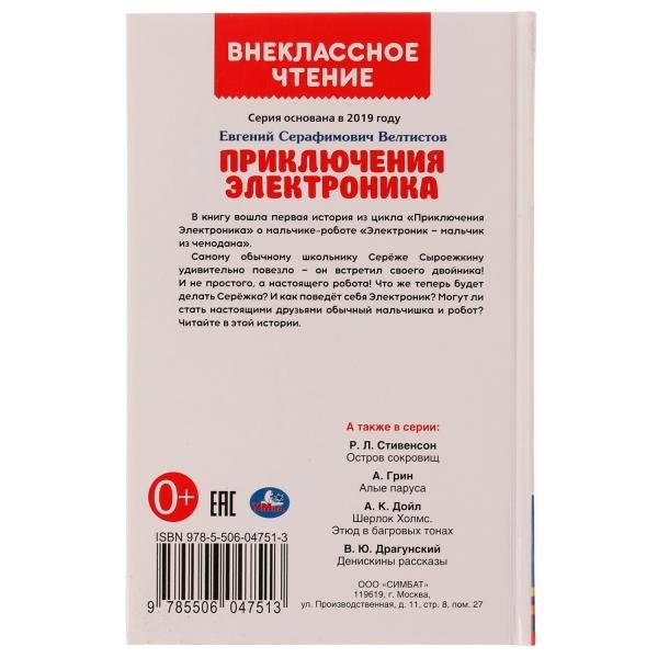 Книга «Е. Велтистов. Приключения Электроника» из серии «Внеклассное чтение» ТМ «УМка» - отличный вариант для самостоятельного чтения вне занятий в школе: произведение печатается без сокращений; увлекательный сюжет; яркие крупные картинки; крупный шрифт; твёрдый переплёт; удобный формат; соответствует ФГОС. В книгу вошла первая история из цикла «Приключения Электроника» о мальчике-роботе «Электроник - мальчик из чемодана». Ребёнок с удовольствием будет читать про удивительные приключения Серёжи Сыроежкина, его двойника - робота Электроника и их друзей. А блок с красочными иллюстрациями сделает чтение ещё более интересным. Благодаря компактному размеру книгу удобно брать с собой в дорогу. Чтение книг из серии «Внеклассное чтение» ТМ «УМка» расширяет кругозор и развивает образное мышление, визуальное восприятие, внимание, память, речь.