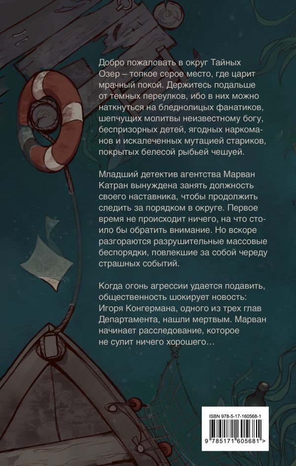 Добро пожаловать в округ Тайных Озер – топкое серое место, где царствует мрачный покой. Держитесь подальше от темных переулков, ибо в них можно наткнуться на бледнолицых уверовавших фанатиков, шепчущих молитвы неизвестному богу, беспризорных детей, ягодных наркоманов и искалеченных мутацией стариков, покрытых белесой рыбьей чешуей. Младший детектив агентства Марван Катран вынуждена занять должность своего наставника, чтобы продолжить следить за порядком в округе. Первое время не происходит ничего, на что стоило бы обратить внимание… Пока не начинаются разрушительные массовые дебоши, повлекшие за собой череду страшных событий. Когда огонь агрессии подавлен, общественность шокирует новость: Игоря Конгермана, одного из трех глав Департамента, нашли мертвым. У мужчины на руках отсутствуют пальцы, язык грубо вырван из полости рта, а вместо глаз зияют два темных отверстия.