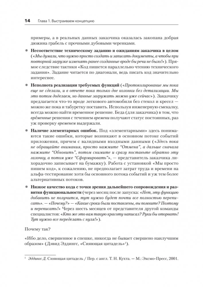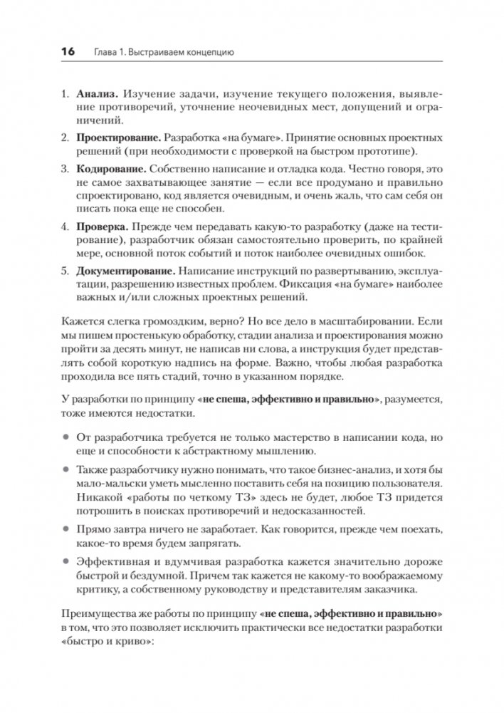 Книга Никиты Зайцева aka WildHare — пример того, как можно систематизировать и упаковать в текстовый формат профессиональный опыт, накопленный за почти двадцать пять лет успешной инженерной практики. Познакомьтесь с концепцией разработки прикладного ПО через эффективность процесса на всех стадиях – от работы с ожиданиями и требованиями до сопровождения и технической поддержки. Все приведенные в книге принципы, правила и рекомендации базируются исключительно на личном практическом опыте автора. Книга была написана исходя из девиза, вынесенного в название – неспеша, эффективно и правильно.