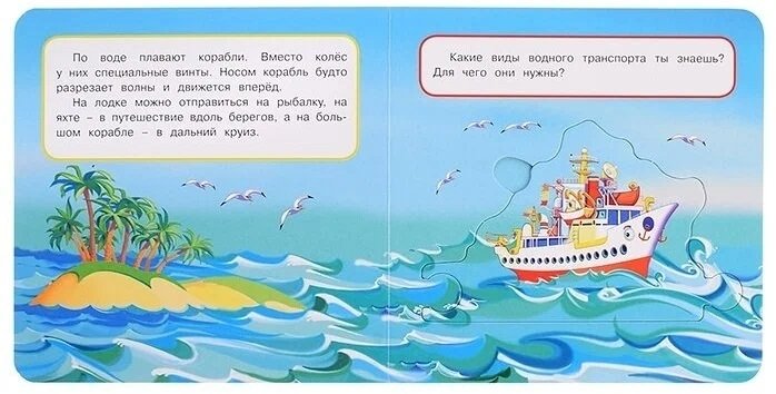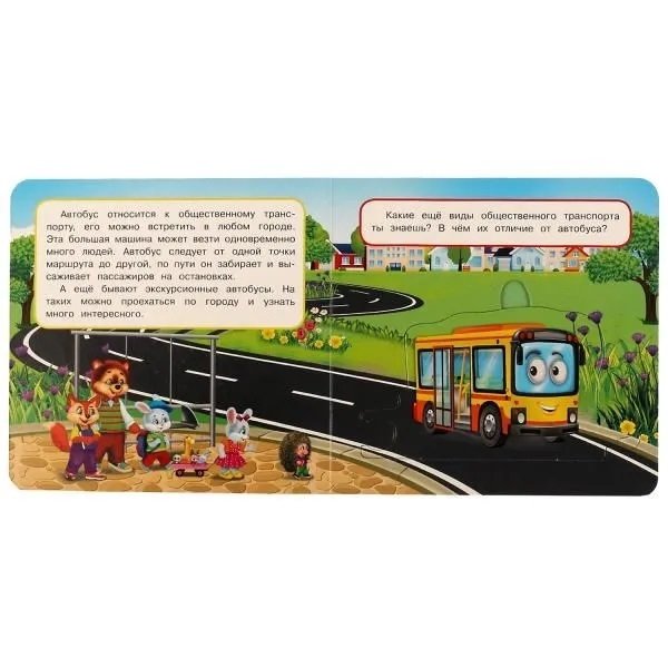Ребёнок с удовольствием будет рассматривать яркие страницы, узнавать разные виды транспорта и играть с пазлами: их можно вставлять-вынимать из пазов, а можно сложить в ряд и получить одну общую картинку. Книжка сделана из плотного картона, поэтому мамы могут не опасаться, что ребёнок порвёт странички.