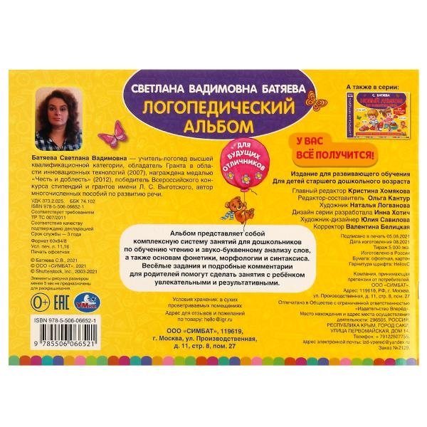 Альбом по развитию речи «С. Батяева. Логопедический альбом» ТМ «УМка» станет отличным вариантом для эффективного обучения ребёнка: - уникальная авторская методика - соответствует ФГОС - занимательные задания - красочные иллюстрации Данный альбом представляет собой комплексную систему занятий для дошкольников по обучению чтению и звуко-буквенному анализу слов, а также основам фонетики, морфологии и синтаксиса. Весёлые задания и подробные комментарии для родителей помогут сделать занятия с ребёнком увлекательными и результативными. Занятия с развивающим альбом ТМ «УМка» стимулируют интерес к учёбе и развивают: - мышление - память - внимание - моторику - усидчивость Объём: 96 стр. Формат: 280 х 205 мм. Материал: офсетная бумага. Рекомендовано детям 6-7 лет.