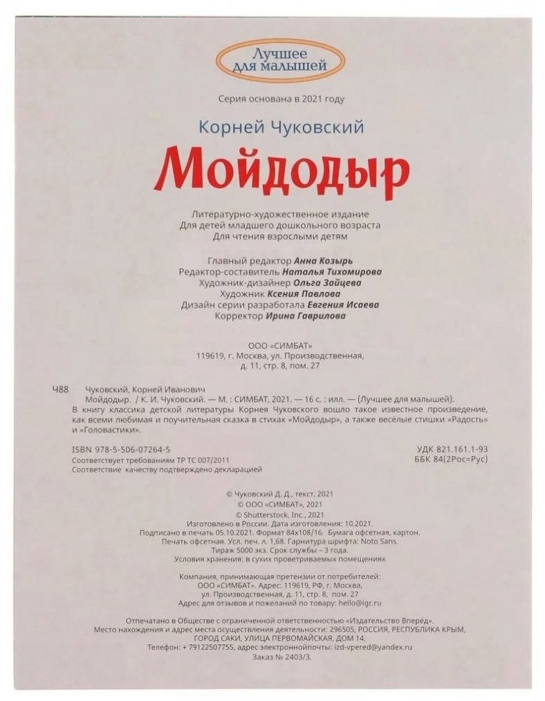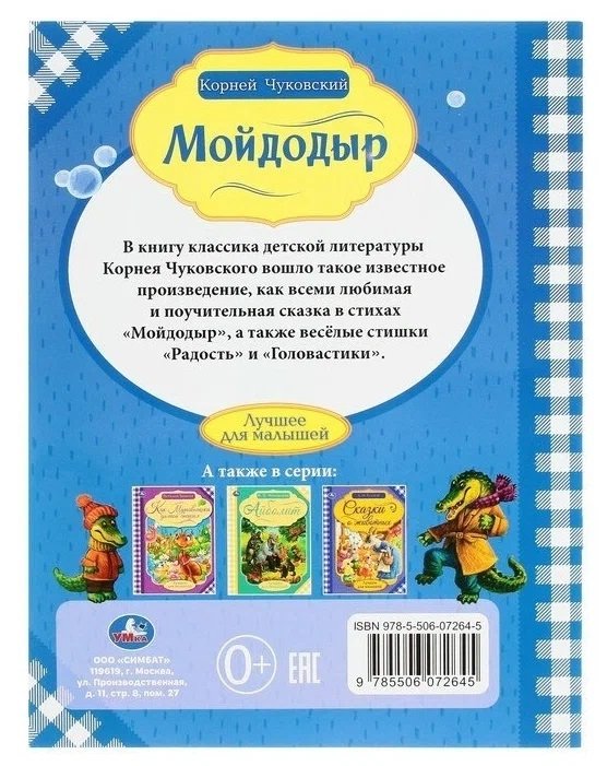 В книгу классика детской литературы Корнея Ивановича Чуковского вошла всеми любимая и поучительная сказка «Мойдодыр», а также два весёлых стишка. С красочными картинками большого формата чтение этих произведений станет ещё увлекательнее. Книгу удобно хранить на полке или брать с собой в дорогу.