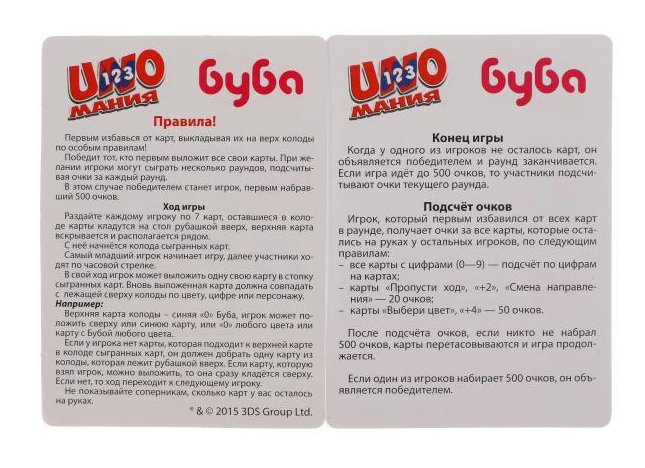 Цель игры - первым избавиться от своих карт, выкладывая их на верх колоды по простым правилам (представлены в инструкции). В игре могут принимать участие от 2 до 6 человек. Компактный набор удобно брать с собой - теперь в дороге можно играть и учиться.