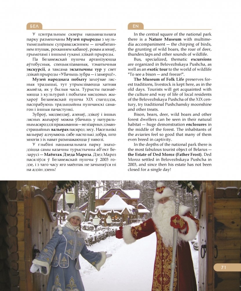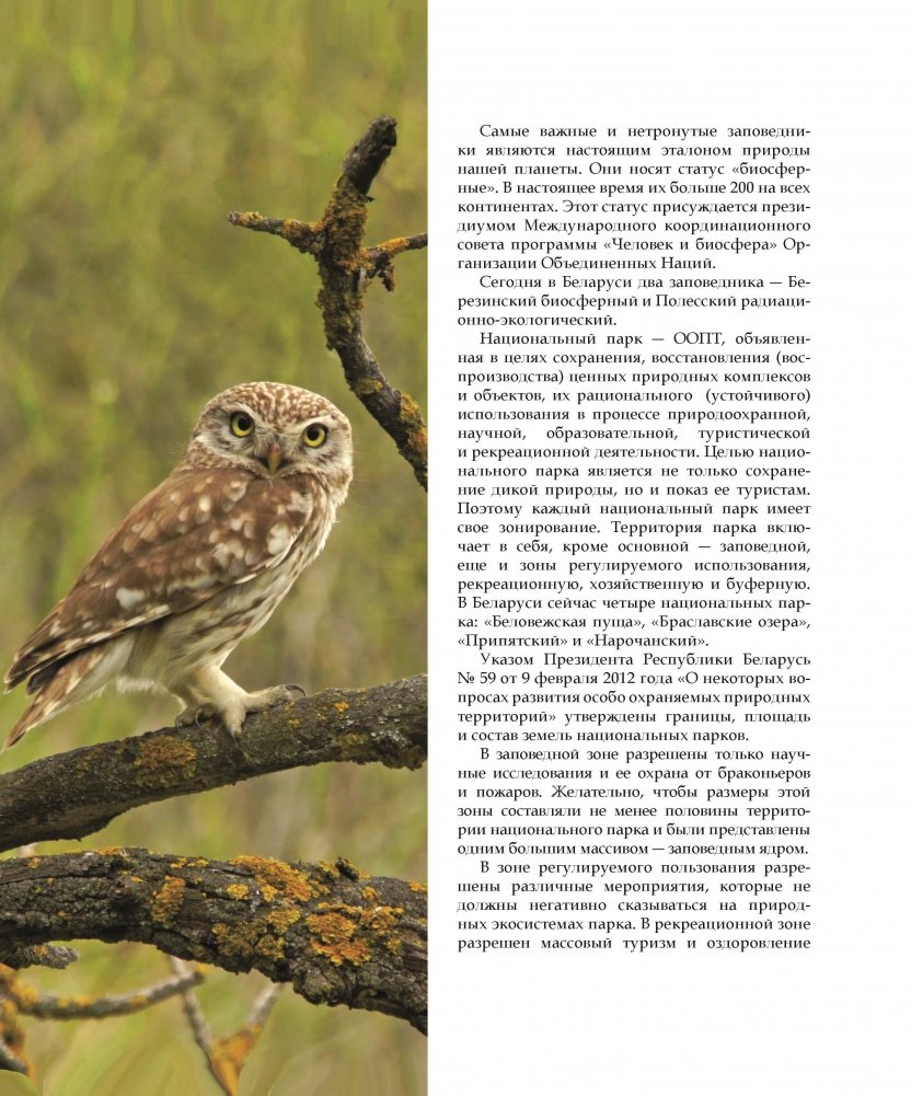 Книга посвящена особо охраняемым природным территориям Беларуси ― четырем национальным паркам («Беловежская пуща», «Браславские озера», «Нарочанский», «Припятский»), Березинскому биосферному и Полесскому радиационно-экологическому заповедникам, знакомит с историей их образования, с удивительным животным и растительным миром, многие представители которого занесены в Красную книгу Республики Беларусь, рассказывает о туристических достопримечательностях национальных парков и заповедников, доступных для посетителей экскурсиях, маршрутах, экологических тропах, базах отдыха, гостиницах, местах рыбалки и охоты.