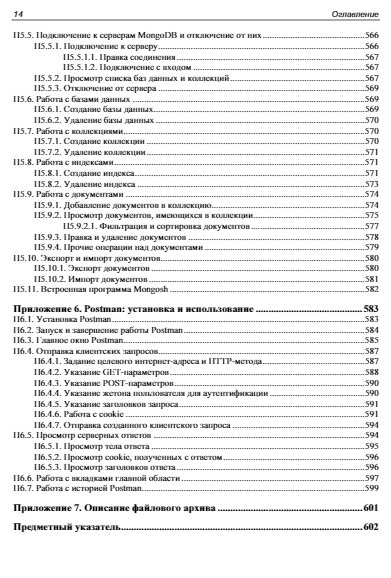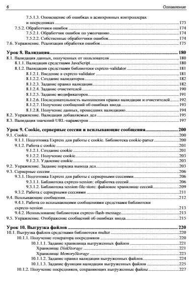 В книге 23 урока, более 40 практических упражнений и заданий для самостоятельной работы. Даны основы программирования на Node.js: проекты и манифесты, установка дополнительных библиотек, импорт и экспорт. Описан серверный веб-фреймворк Express: работа с запросами и ответами, маршрутизация, шаблонизатор EJS, обработка пользовательских данных, статических файлов, валидация, сохранение выгруженных файлов, вывод сообщений об ошибках и разграничение доступа. Показана работа с СУБД MongoDB: запись и выборка данных, фильтрация, сортировка, применение моделей Mongoose. Рассказано о двухзвенных веб-приложениях, бэкендах и фронтендах. Рассмотрено программирование бэкендов средствами Express и фронтендов с применением клиентского веб-фреймворка React. Затронуты вопросы повышения производительности и защищённости веб-приложений, ввод их в эксплуатацию. Электронный архив на сайте издательства содержит полный исходный код описанных в книге примеров.