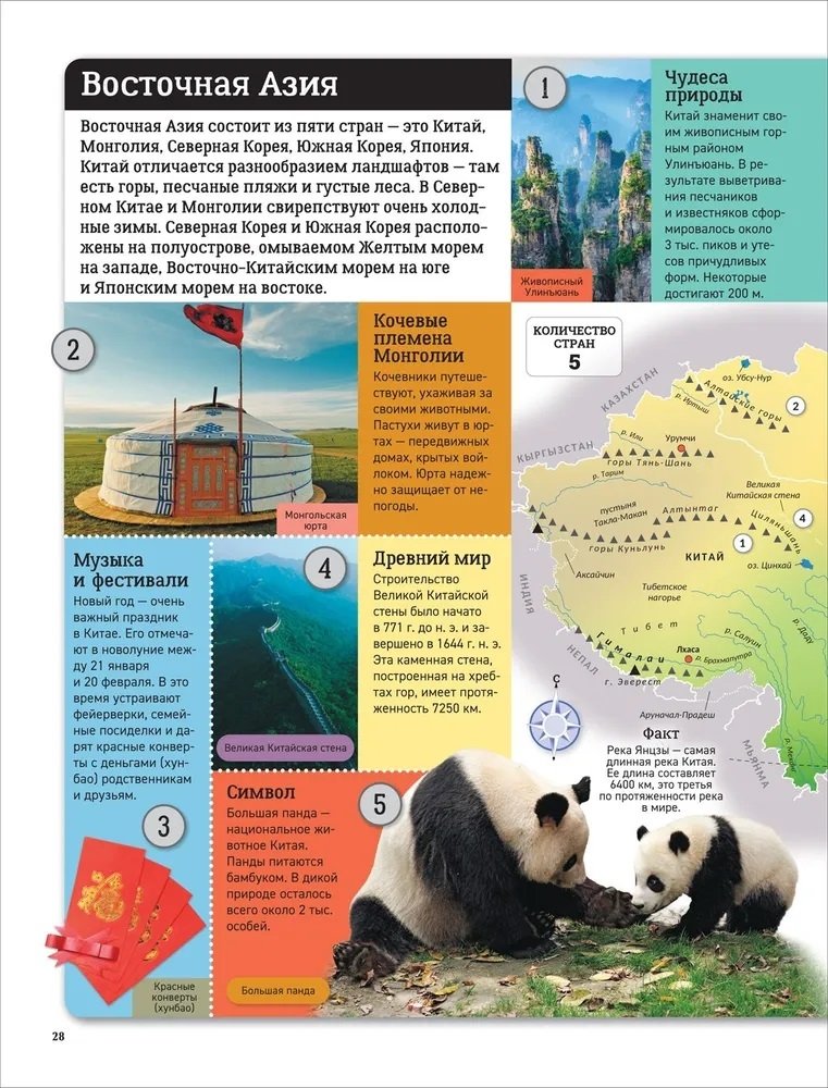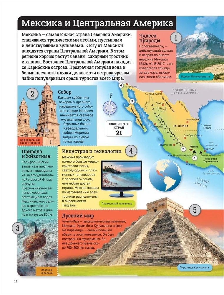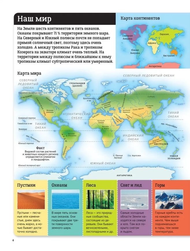 Этот атлас мира составлен по континентам. На каждой странице атласа вы найдете карты, фотографии и информацию о людях, городах, природе и достопримечательностях, которые есть в каждой части мира. Мы приглашаем вас в путешествие по странам и континентам.