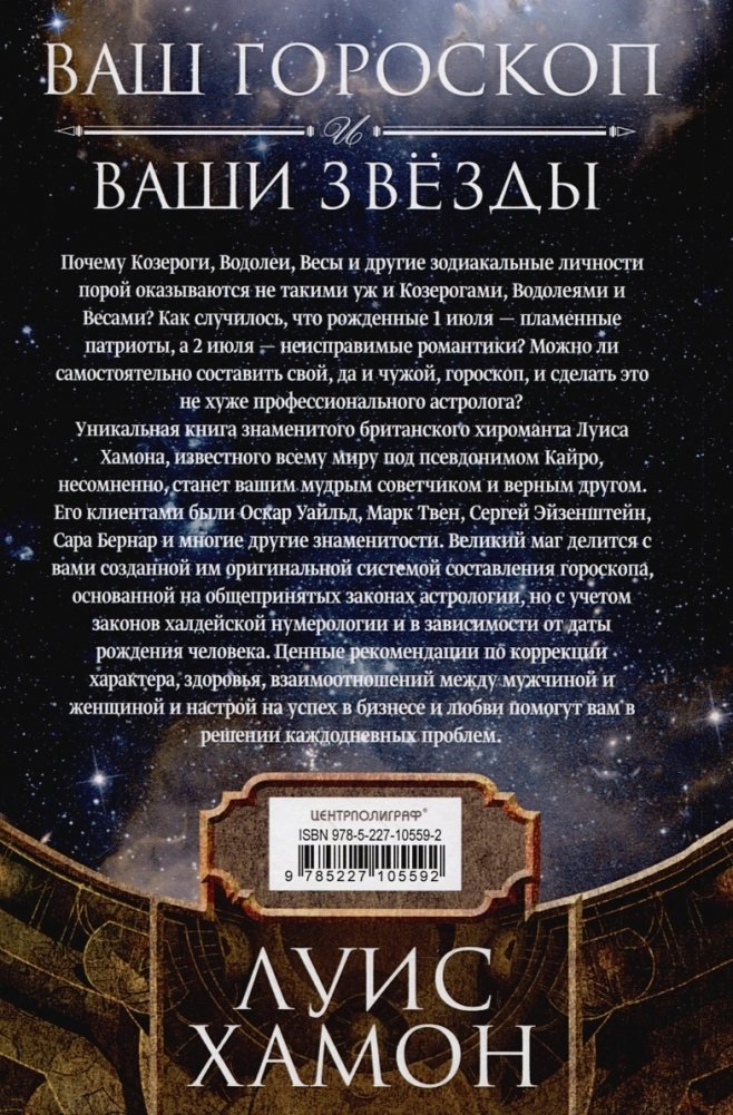 Знаменитый британский хиромант Луис Хамон, известный всему миру под псевдонимом Кайро, представляет созданную им оригинальную систему составления гороскопа, основанную на общепринятых законах астрологии, но с учетом нумерологии и в зависимости от даты рождения. Рекомендации по коррекции характера, здоровья, взаимоотношений между мужчиной и женщиной и настрой на успех в бизнесе и любви, по мнению автора, помогут в решении каждодневных проблем.