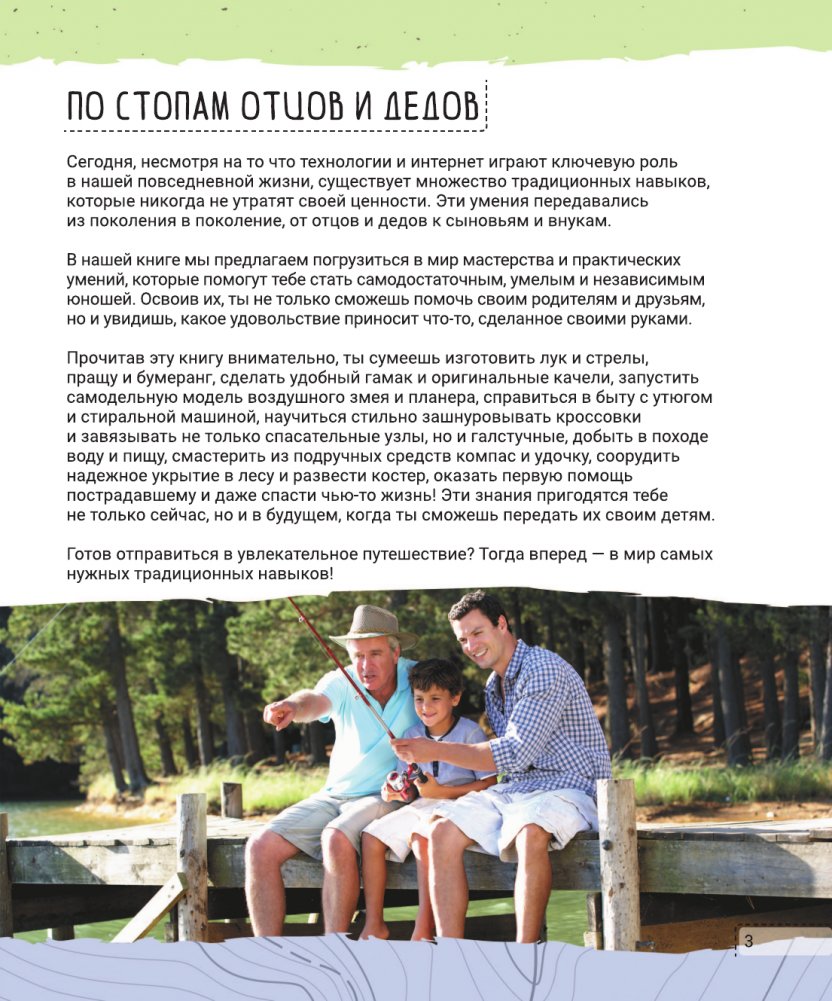 Сделать скворечник и посадить дерево, смастерить этажерку и изготовить елочные игрушки, поставить палатку и развести костер — это всё традиционные навыки, которыми в совершенстве владели наши папы и деды. И спустя много лет они не утратили своей ценности, их передавали из поколения в поколение. Современному человеку тоже совсем не лишним будет научиться ловить рыбу, своими руками сделать модель самолета, лук или арбалет, самостоятельно приготовить себе еду, пришить пуговицу или удалить занозу из пальца.