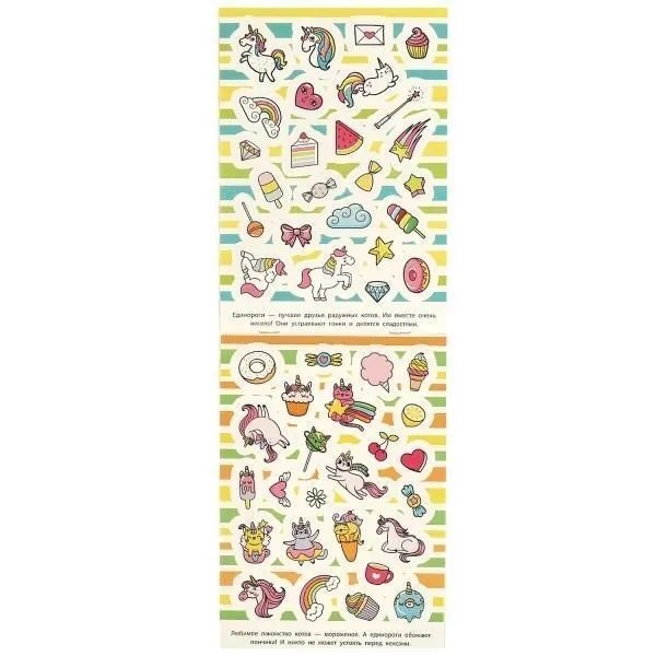 В этом альбоме наклеек собраны самые кавайные картинки с изображением котов и сладостей. Ваш ребёнок может приклеивать стикеры на альбомы, тетради и открытки, а также придумывать свои милые истории.