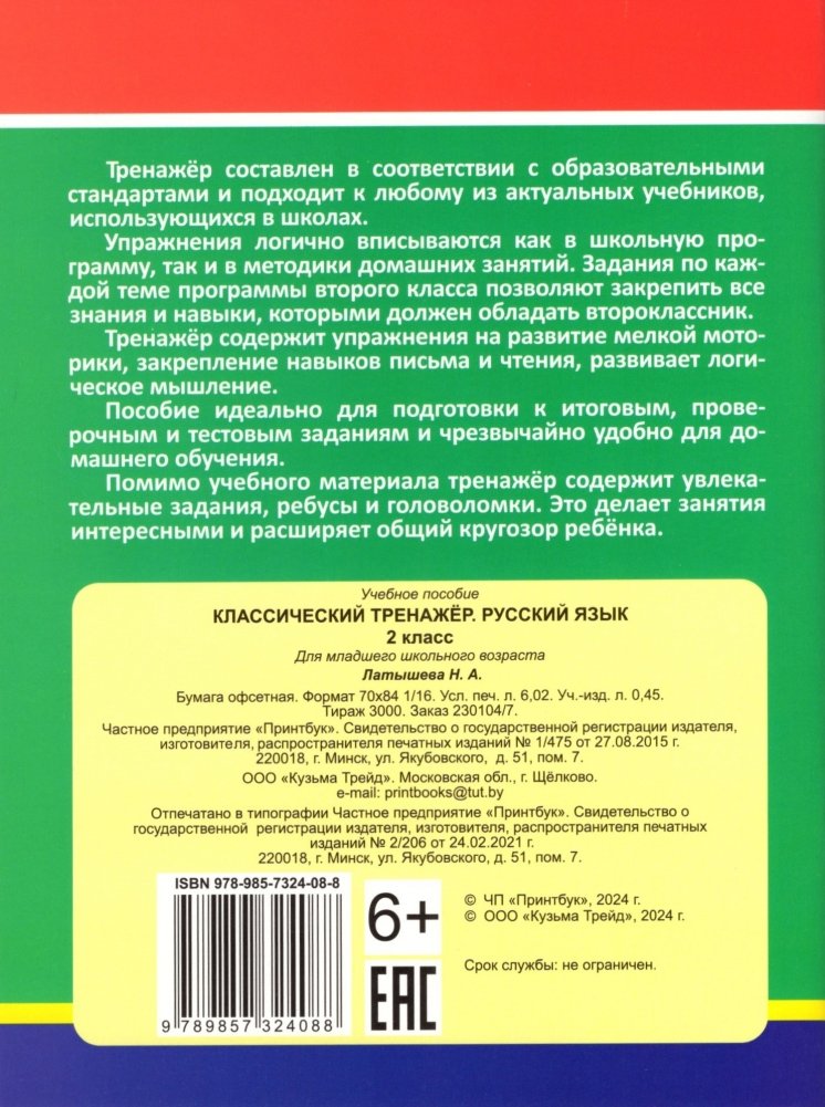 Тренажёр содержит упражнения на развитие мелкой моторики, закрепление навыков письма и чтения, развивает логическое мышление.