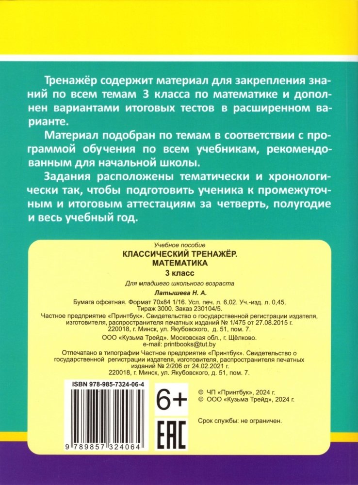 Тренажёр содержит материал для закрепления знаний по всем темам 3 класса по математике и дополнен вариантами итоговых тестов в расширенном варианте.