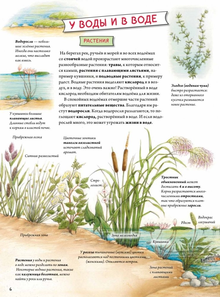 Ты замечал, что на берегах рек, озёр, прудов или даже в толще воды вовсю кипит жизнь? В прибрежной зоне растут разнообразные травы и цветы, по водной глади бегают насекомые и плавают птицы, а в камышах прячутся лягушки. Наблюдать за ними очень интересно и познавательно! Из этой книги ты узнаешь о цаплях, зябликах, ракушках, рыбах, водорослях и многих-многих других обитателях водоёмов. А запомнить, как они выглядят, помогут нежные и подробные акварельные иллюстрации автора.