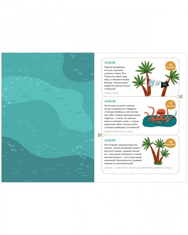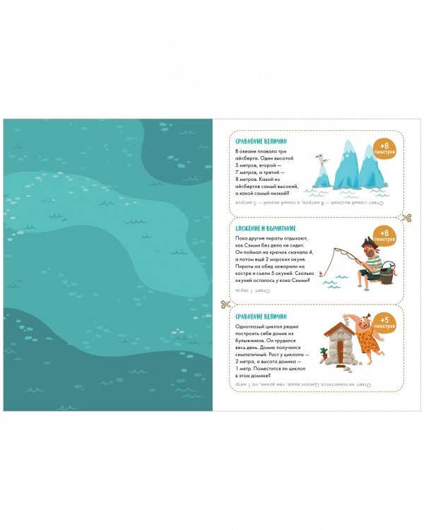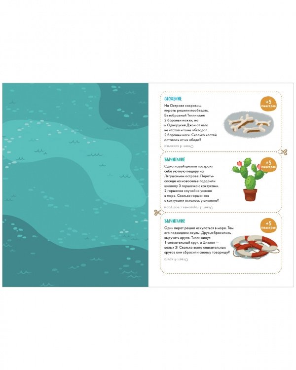«Пиратская математика» включает 5 вариантов игр. Основная игра “Остров сокровищ” с ходьбой фишками по полю подойдет как для пиратов помладше (от 4 лет), так и для капитанов постарше (от 6 лет).