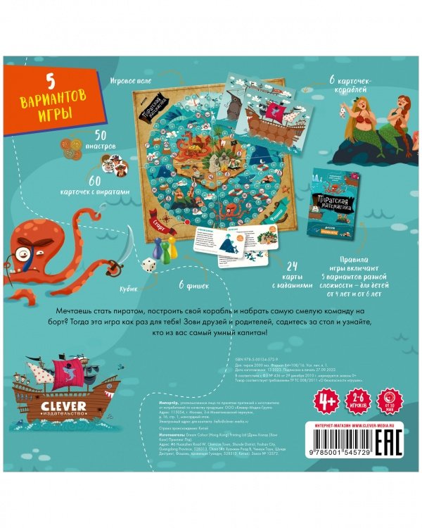 «Пиратская математика» — это настольная игра-стратегия для всей семьи. Бороздя морские просторы, вы попадете в приключения, а может (если удача улыбнется), подзаработаете золота. Соберите полную команду пиратов на своем корабле! Честно считайте монеты и старайтесь не ошибаться. Семь футов под килем!