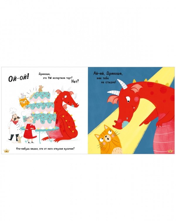 Дракоша ОЧЕНЬ любит сладкое! Именно поэтому повара решили спрятать восхитительный, ароматный и просто умопомрачительный торт, чтобы она не съела его раньше времени. Но Дракоша всё же добралась до него, откусила немного и...обвинила в этом кота! Интерактивная книжка-картинка вовлечёт малыша в чтение и поможет поднять сложную тему правды и лжи, а также научит принимать свои ошибки и извиняться за проступки.